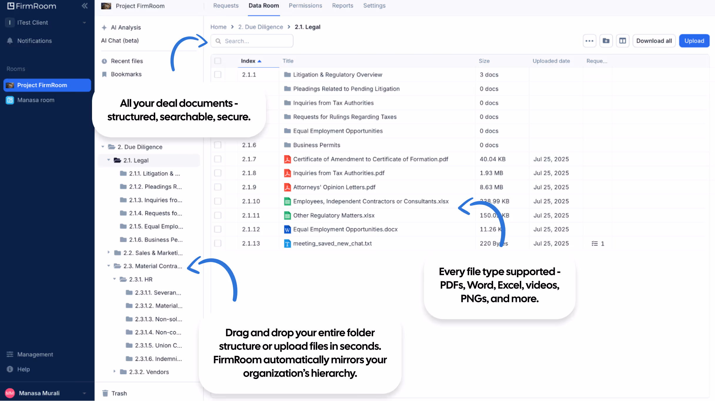 FirmRoom brings the essential tools for secure, high-stakes deals into one clean workspace that just works.